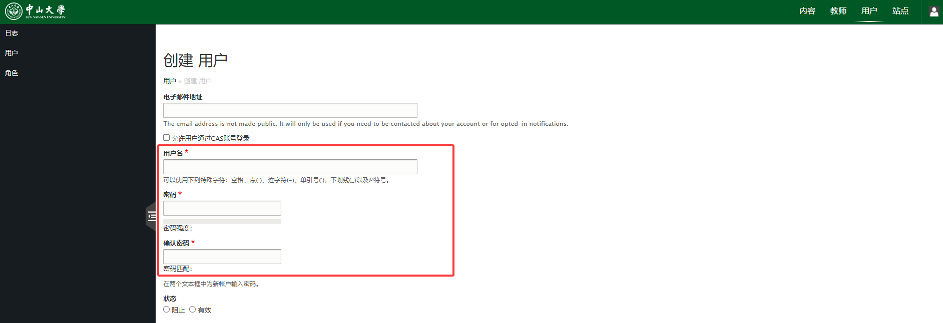 ④带红星处为必填字段,用户密码需要进行二次确认,并且要求两次输入的密码一致。