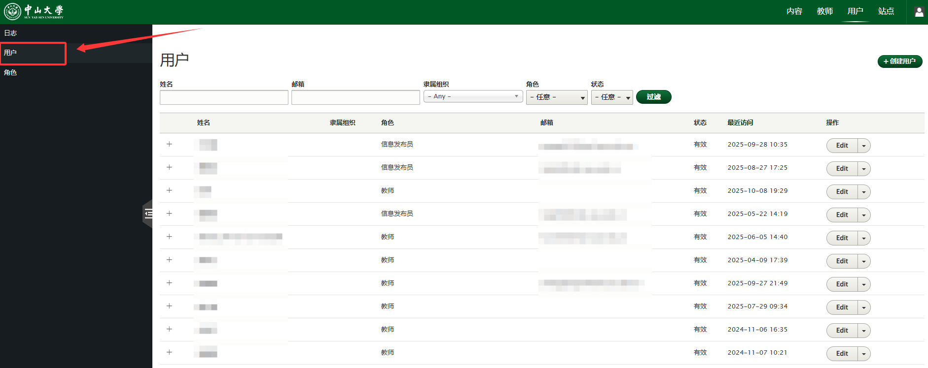①点击左侧菜单的用户,进入用户管理界面。
