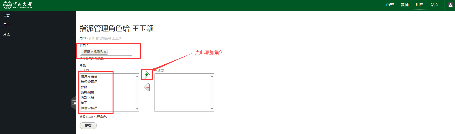 ③选中该用户对应的栏目,Roles选项中选择想要指派的角色,并按添加键添加到已选项方框内,效果下图所示,完成后提交,完成用户角色指派