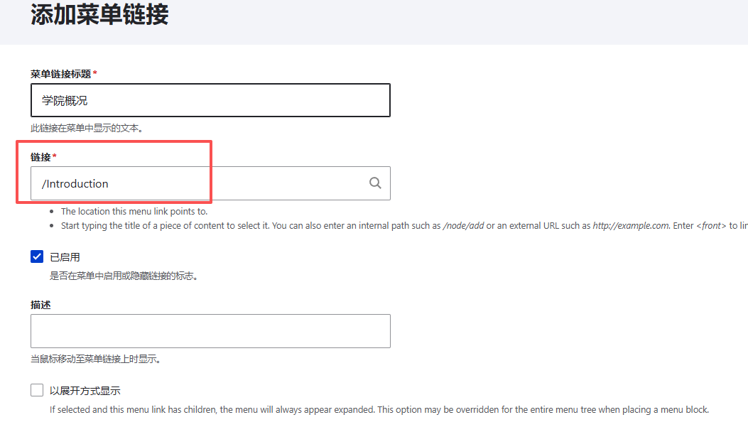 ②链接可填内部链接或者外部链接,内部链接填写相对路径,“/”开头,相对路径可以通过访问需要跳转的页面地址后在浏览器地址栏中获取,例如:岭南学院站点,管理员在岭南学院本站内菜单填写学院概况的链接为“/Introduction”,只取域名后面的路径。外部链接要填写完整的路径,如“http://baidu.com”
