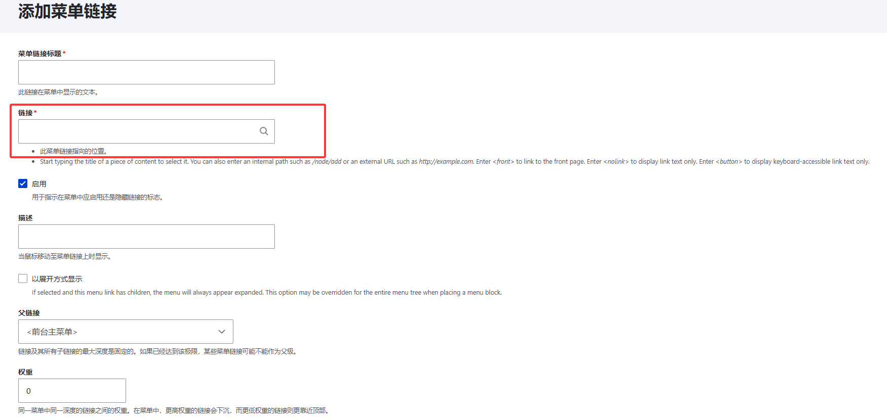 ②链接可填内部链接或者外部链接,内部链接填写相对路径,“/”开头。外部链接要填写完整的路径,如“http://baidu.com”