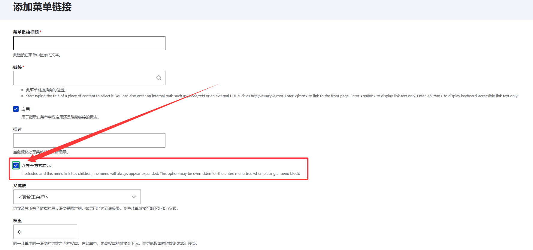 ③若是该菜单链接有子项(也就是二级菜单),需勾选“以展开方式显示”