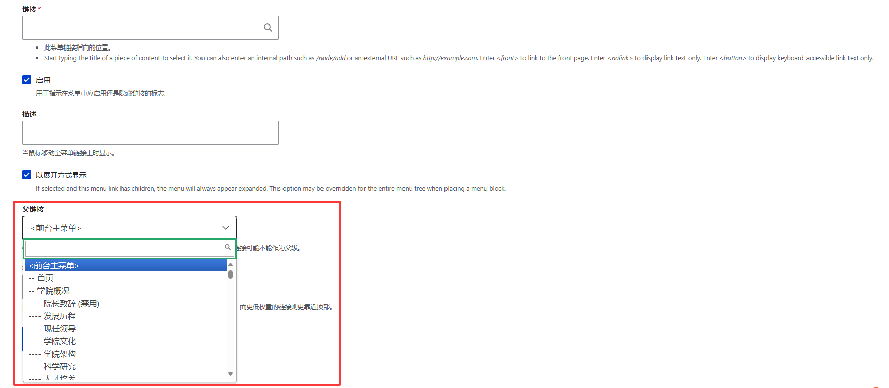 ④可选择新建菜单链接的父值,也就是它的上一级菜单。