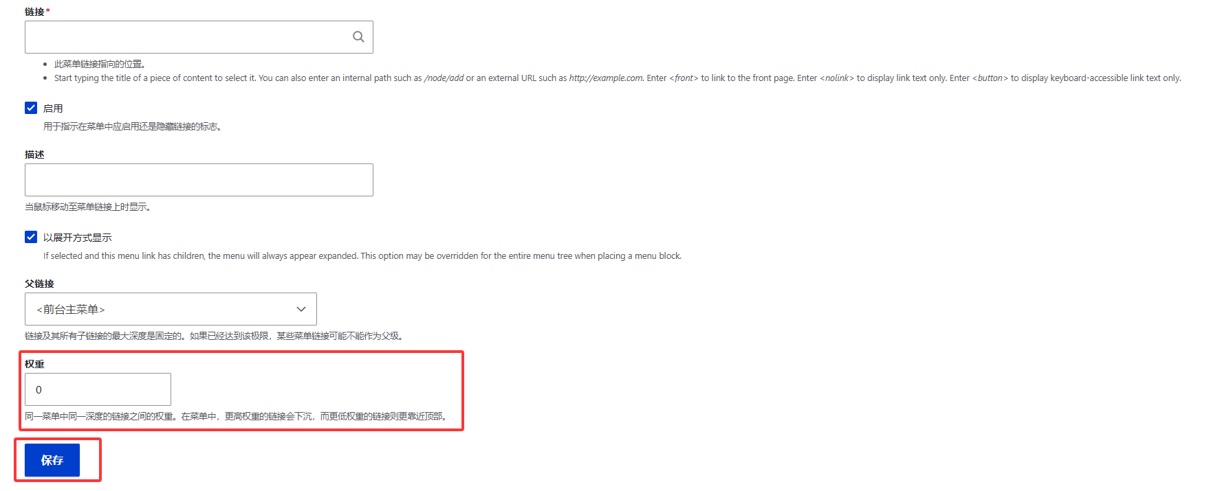 ⑤编辑权重可对该菜单链接进行排序,权重数值越低,排序越靠前,编辑好之后,点“保存”。